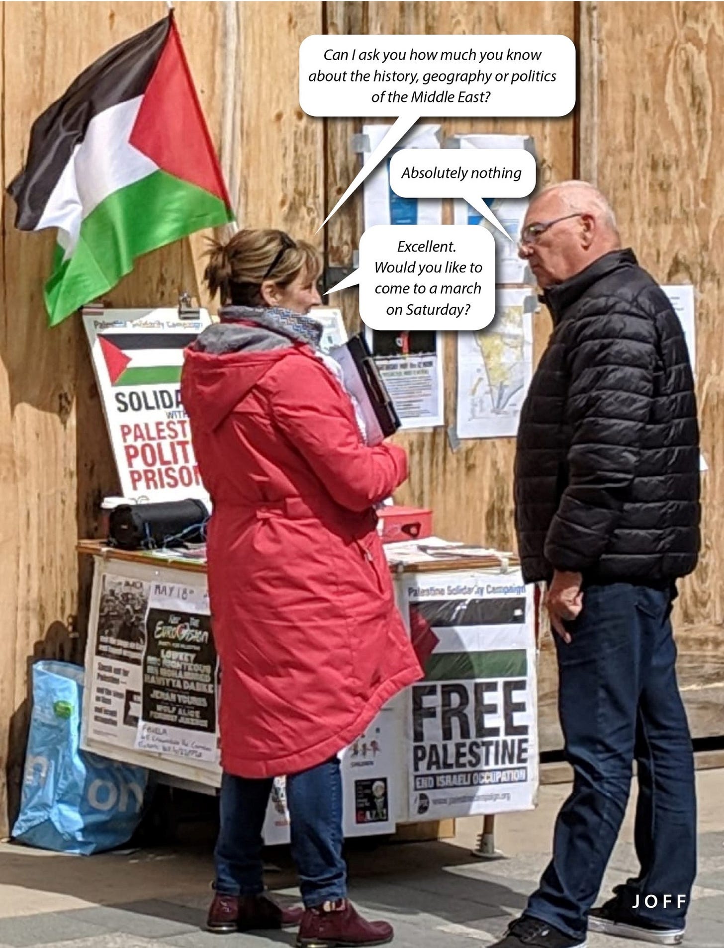 So, instead this week I’ll feature an interview between an older Detective Sergeant and a young student arrested after a clash with police during a pro-Palestinian London march. Again, a satirical style, which indeed throws a spotlight on how lacking in knowledge many pro-Palestinian protesters are.